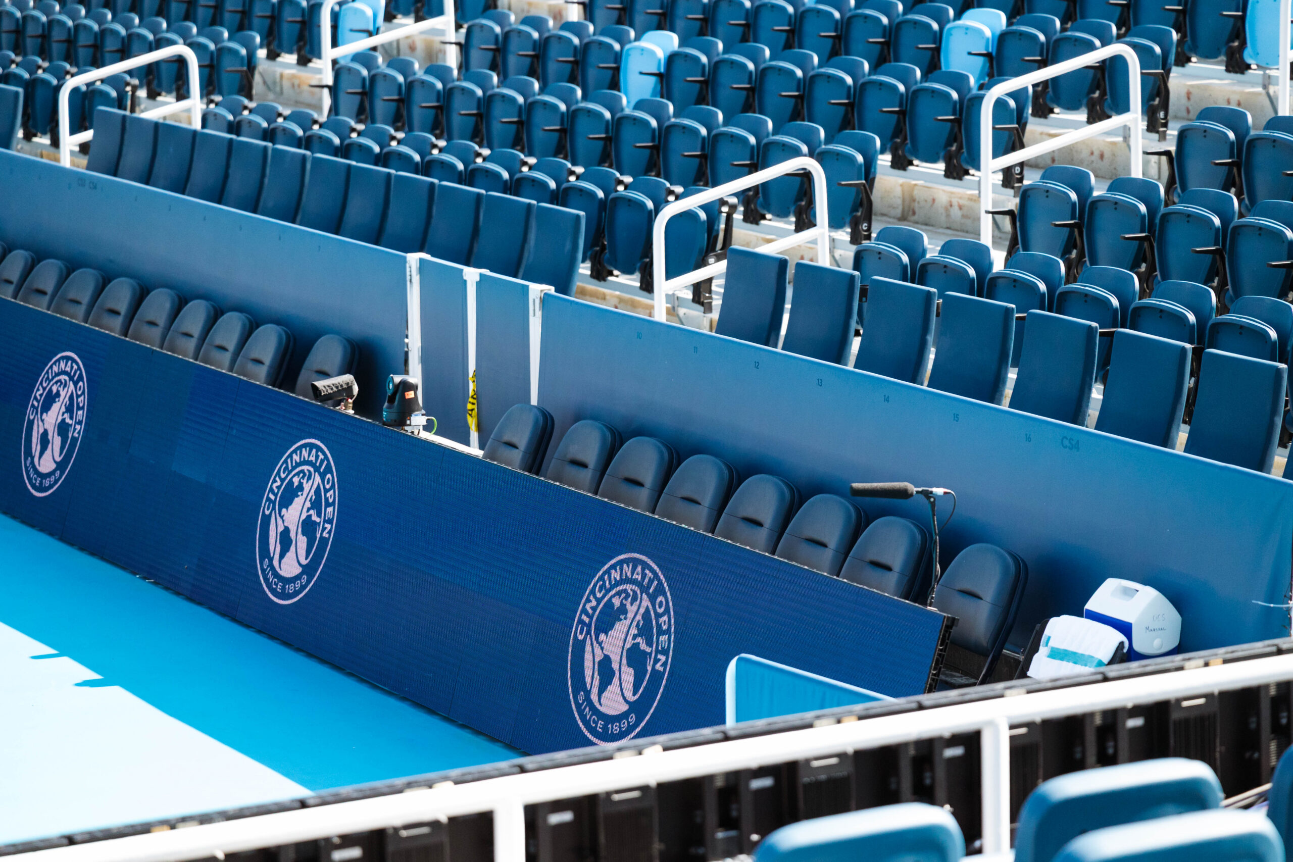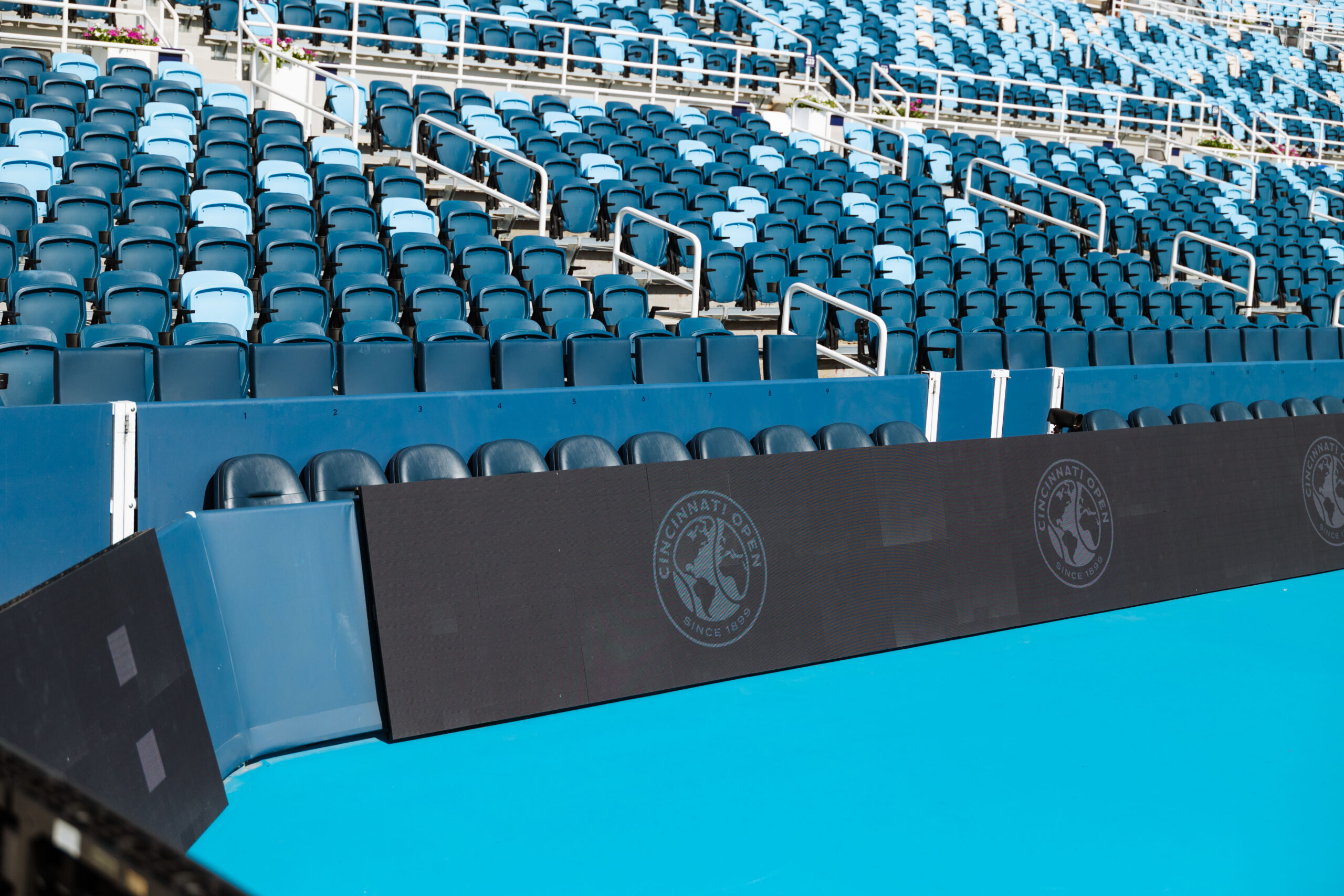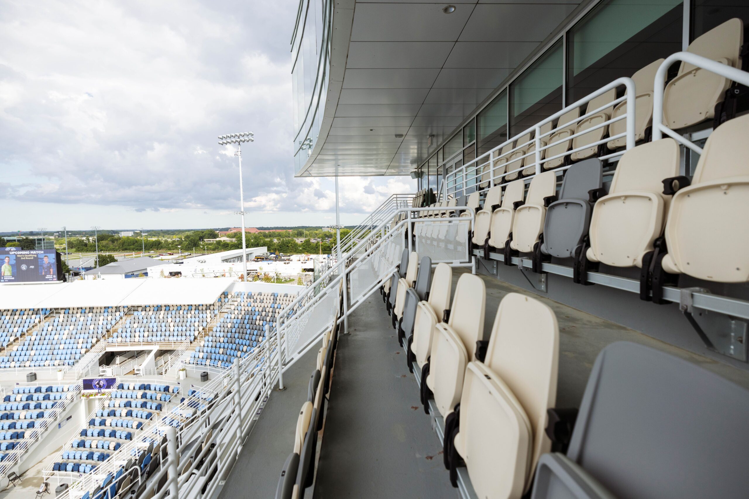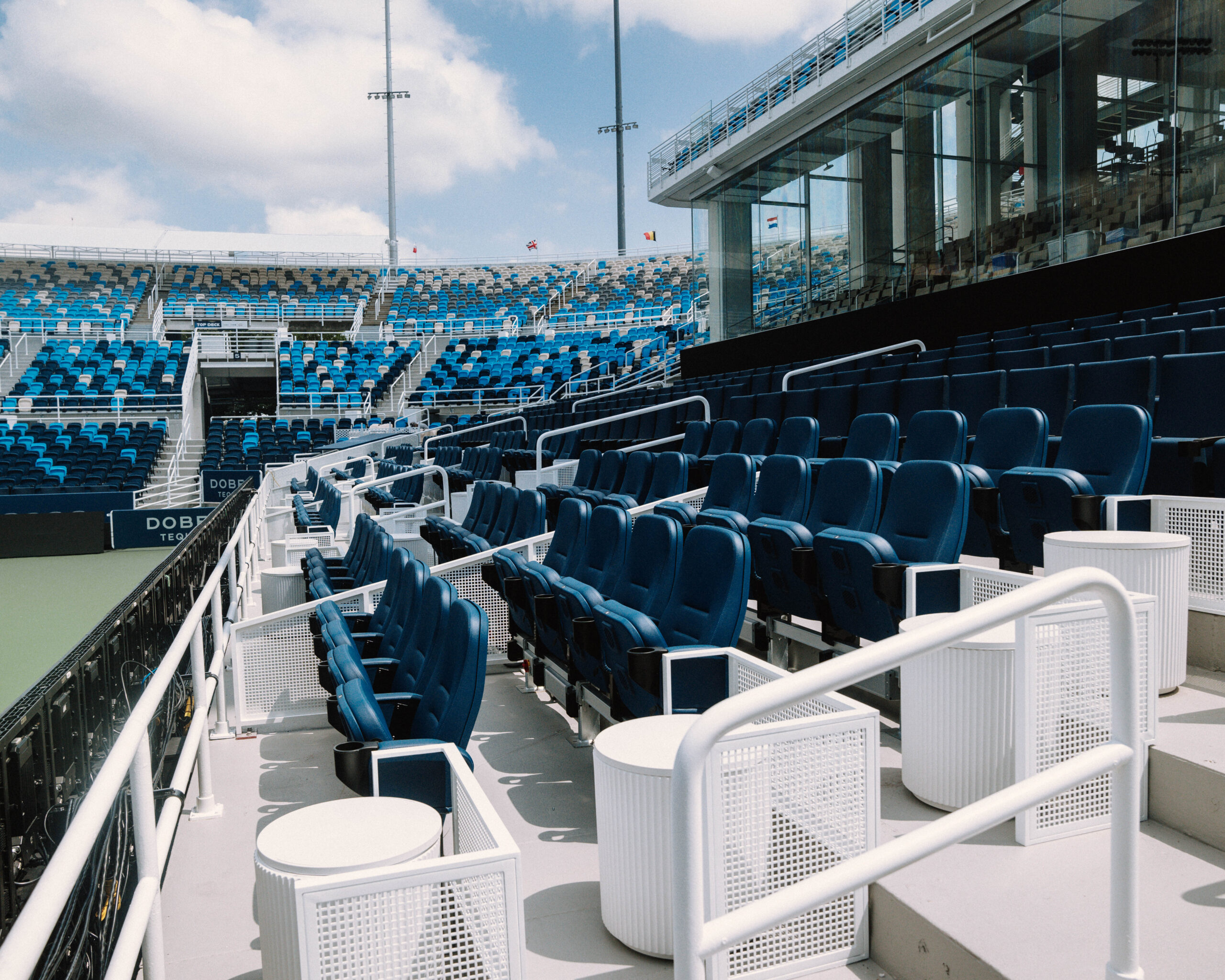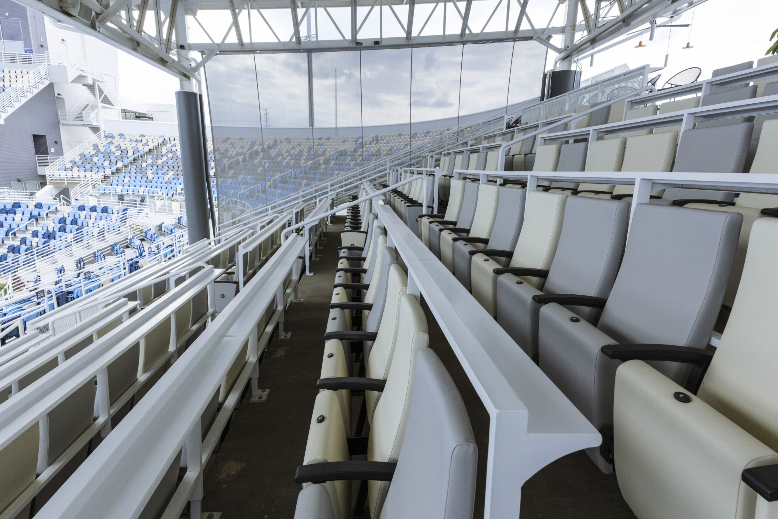 - Stadium-style baseline seating on Center Court behind glassÂ